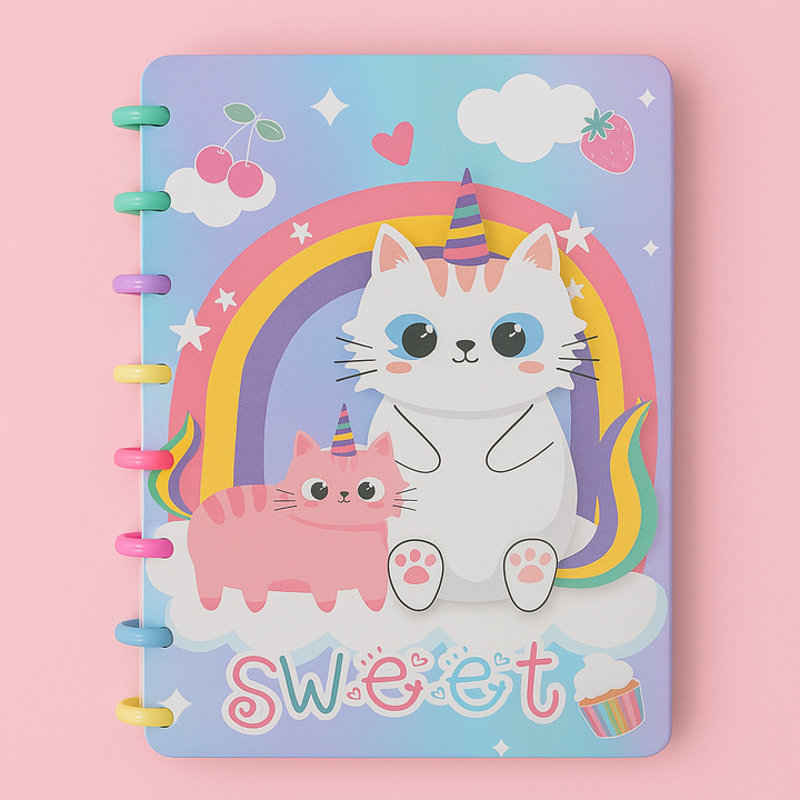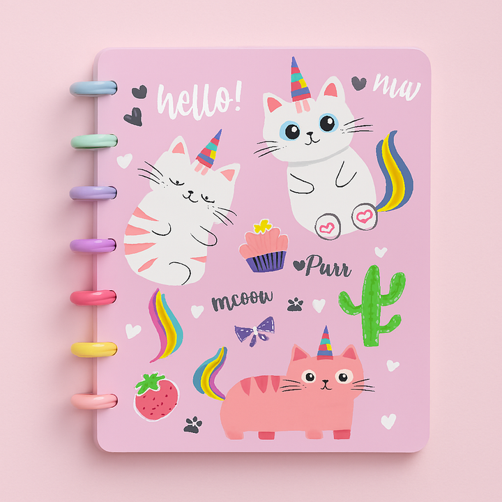 ¡Organiza tus días con estilo y ternura! 🐾✨ Estas agendas con anillos de colores son perfectas para acompañarte en tus estudios, trabajo o actividades diarias. Sus portadas con diseños de gatitos, arcoíris y mensajes motivadores inspiran creatividad y alegría en cada página.