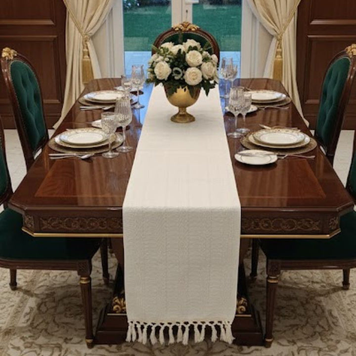 ✨ Aporta elegancia y armonía a tu mesa con este camino en tono marfil. Su diseño tejido y delicados flecos lo convierten en una pieza versátil y sofisticada para cualquier ocasión.