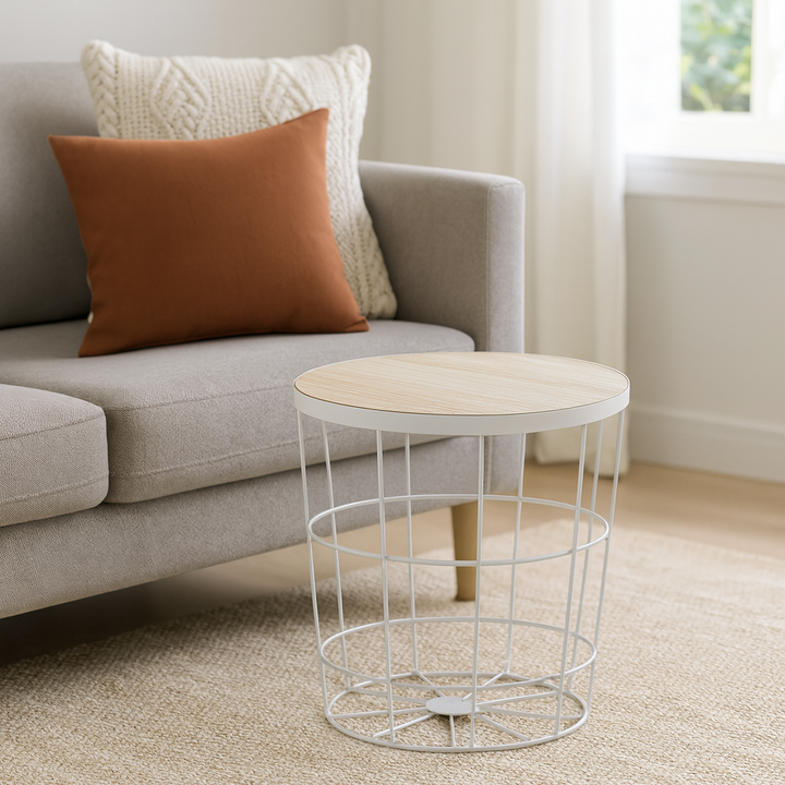 Metal en su estructura y madera MDF en la parte superior, removible para usar ese espacio como un guardador de objetos. ✨🎩