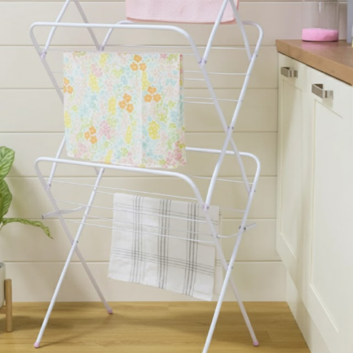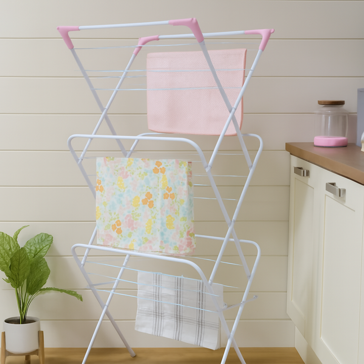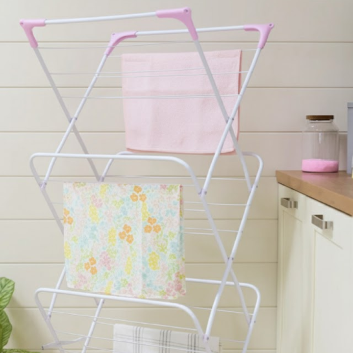 ¡Seca y organiza tu ropa de forma práctica con este estante! 👕✨Su estructura permite un fácil uso y almacenamiento, ideal para interiores o balcones. Con detalles en color rosado que le dan un toque moderno y decorativo.