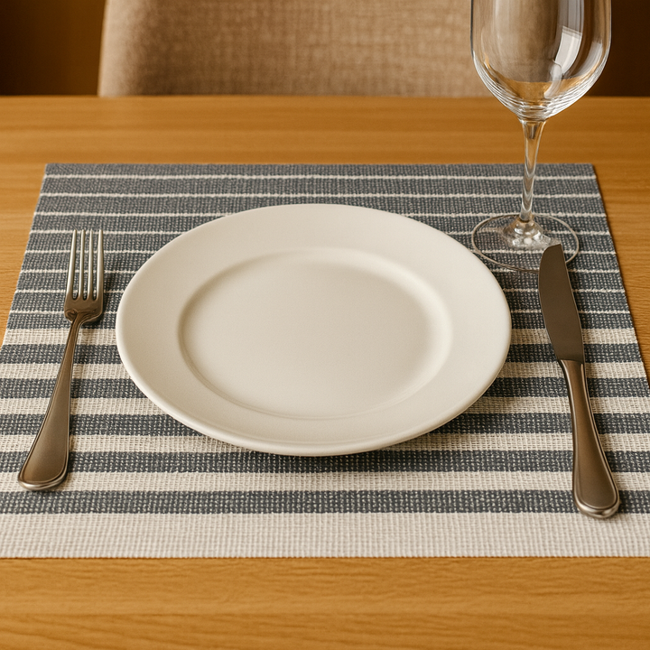 ✨ Aporta un toque moderno y fresco a tu mesa con estos individuales en diseño de franjas gris y blanco. Su estilo minimalista combina fácilmente con cualquier vajilla, creando un ambiente limpio y elegante para tus comidas diarias.