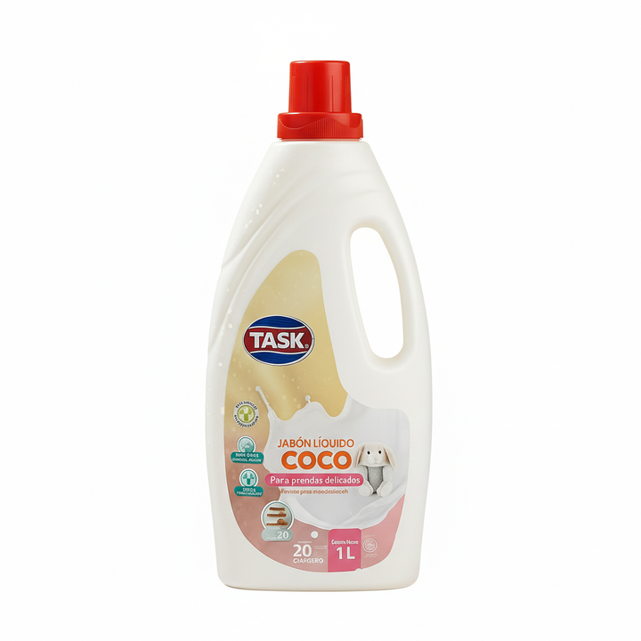 Mantén tus prendas delicadas siempre suaves, limpias y cuidadas con nuestro Jabón Líquido de Coco TASK, formulado especialmente para proteger la ropa de bebé y tejidos finos. Su fórmula suave cuida las fibras, elimina malos olores y deja un aroma natural a coco que encanta.