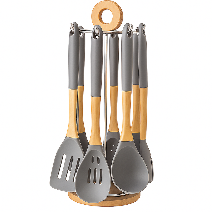 Fabricado en silicona y madera, es ideal para preparar tus recetas favoritas con utensilios resistentes, seguros y fáciles de limpiar, además de mantener todo organizado gracias a su base.