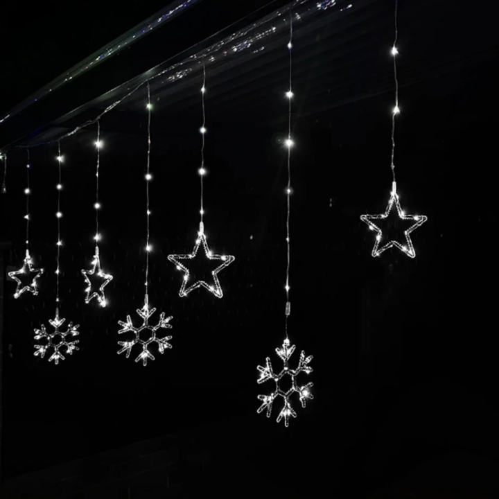 ✨ ¡Haz que tu decoración brille con encanto invernal! ❄️⭐ Estas luces tipo cascada con figuras de estrella y copo de nieve tienen 3 metros de largo y una caída de 80 cm, perfectas para crear un ambiente festivo y mágico.