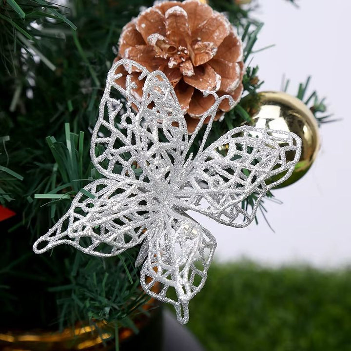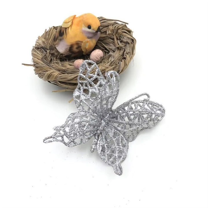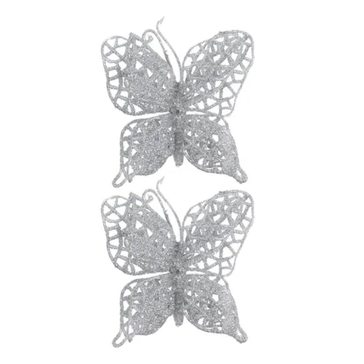 ✨ Agrega un toque brillante y festivo a tu árbol con estas mariposas navideñas en tono plateado escarchado.