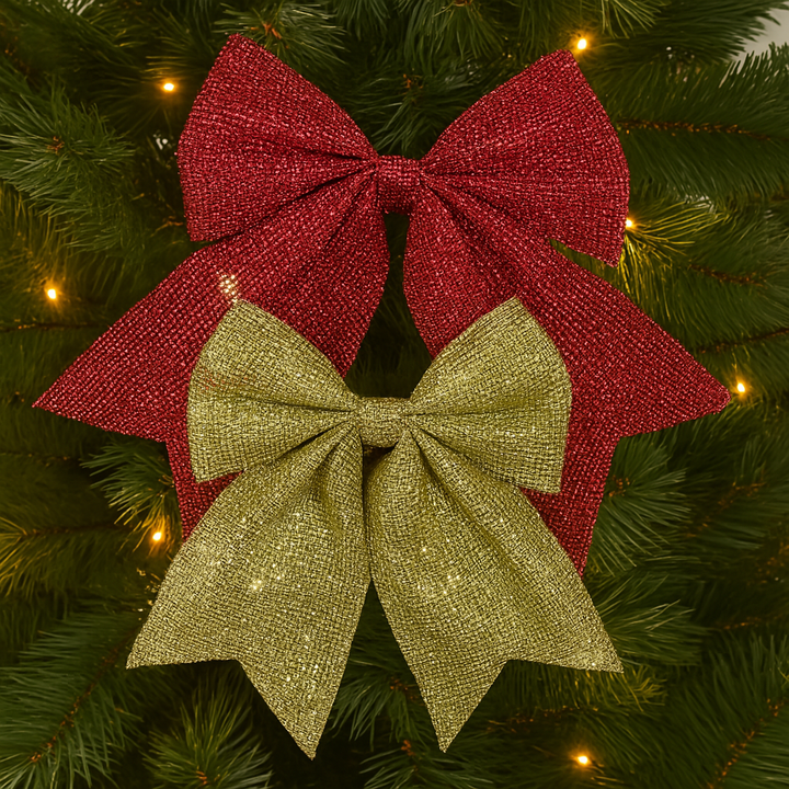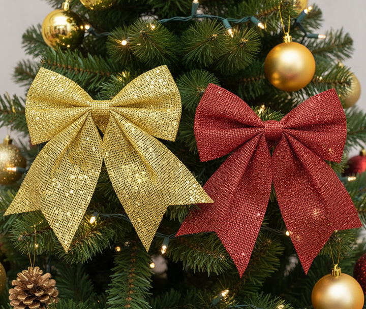 🎀 ¡Agrega un toque elegante y brillante a tu árbol de Navidad! ✨Estos moños decorativos en tonos rojo y dorado son ideales para complementar tu decoración navideña con estilo.