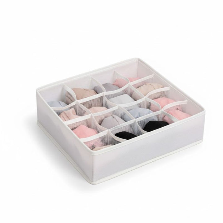Mantén tus prendas siempre en orden con este práctico organizador de compartimientos. Ideal para guardar panties, medias o accesorios, optimizando el espacio en tus cajones.