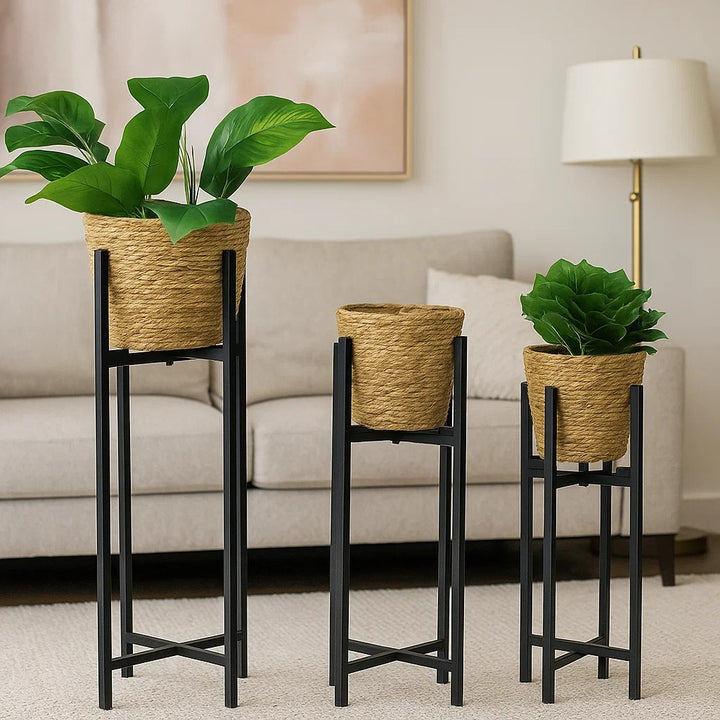 Hechas de mimbre y fibras naturales 🧺 con base metálica elegante 🖤, vienen en tres tamaños perfectos para darle un toque innovador a tu hogar ✨🏡