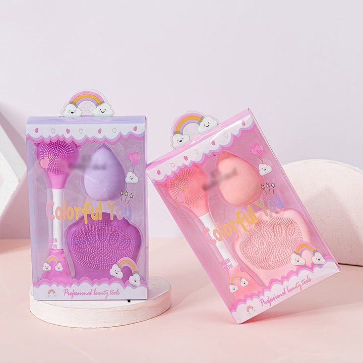 Incluye esponja de maquillaje, cepillo facial de silicona con doble función y guante limpiador en forma divertida, todo en colores llamativos y prácticos para tu día a día. 💕🌸